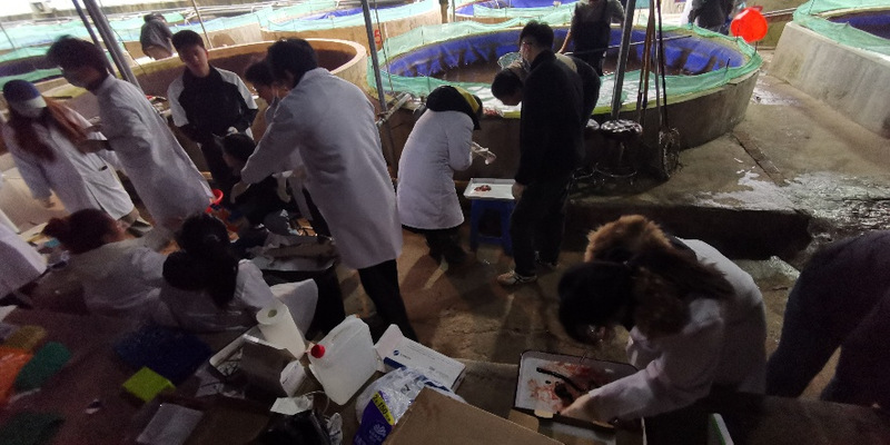 活动伊始,由重点实验室研究生团队对实验鲟鱼进行现场取样。取样过程分工明确、配合有序,充分体现了实验室规范化实验流程与研究生实践能力培养成效。随后,与会专家及企业代表对实验鲟鱼阶段性相关成果进行鉴定与交流,特别是对针对不同养殖方式的鱼肉品质进行了抽样检测,效果良好。